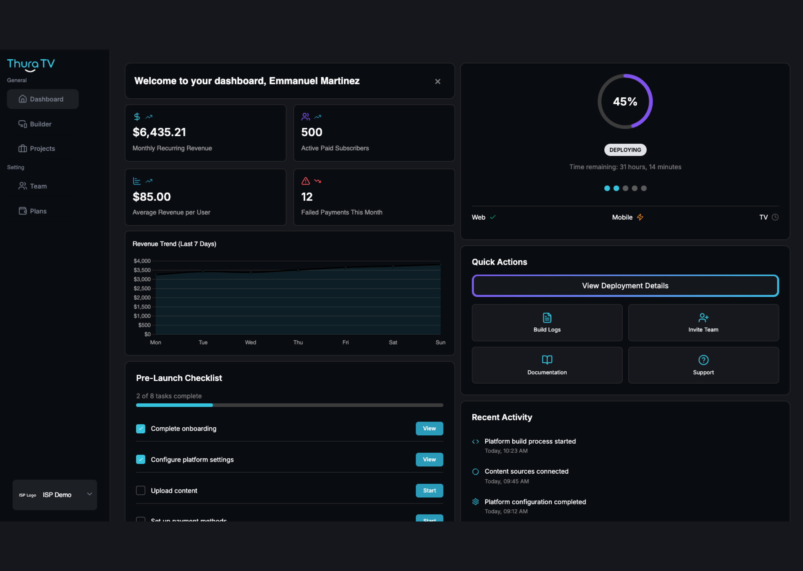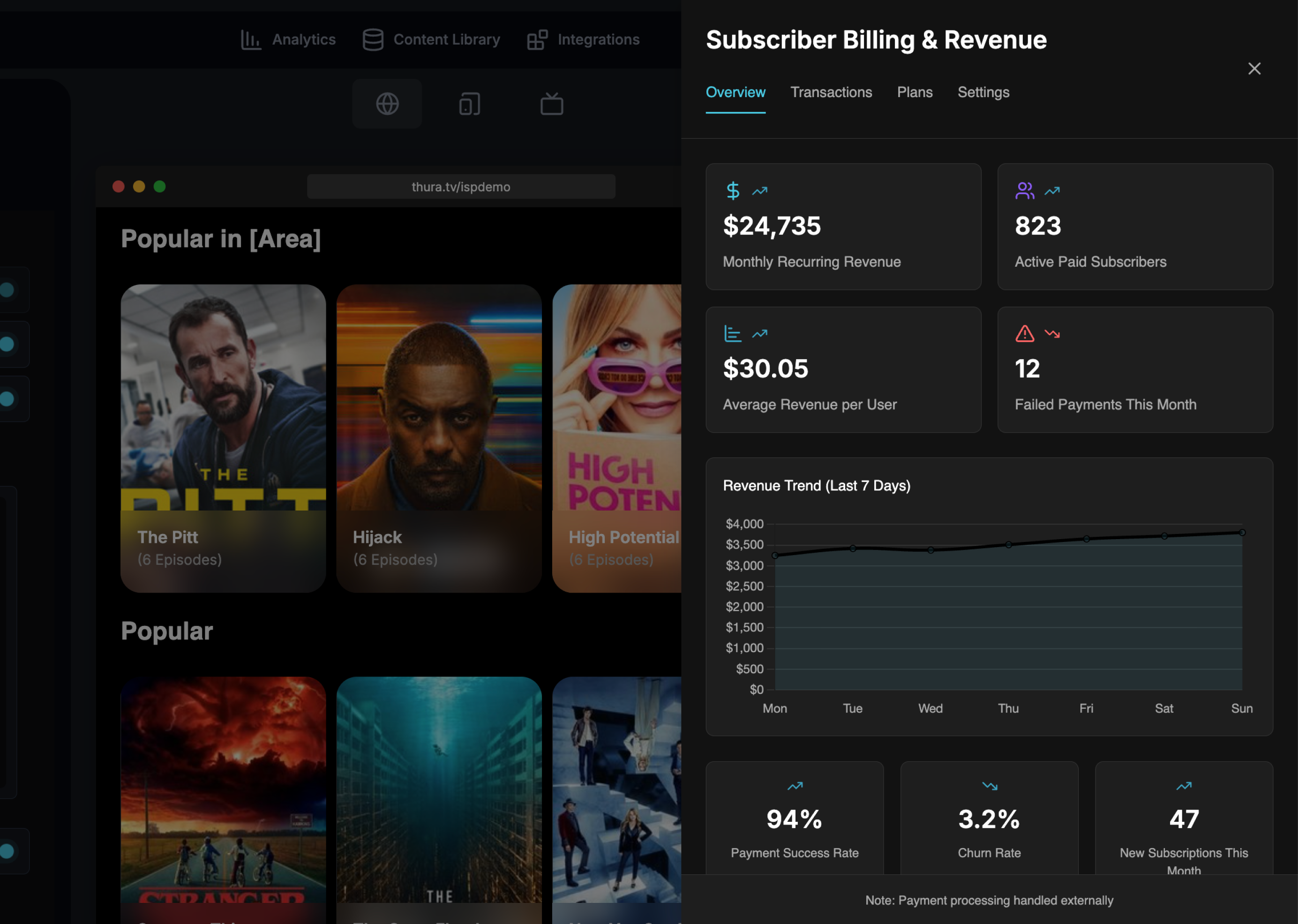 Xfinity and T-Mobile give their customers branded streaming apps, perks, and premium experiences. Now your ISP can too. Thura TV is white-label infrastructure that lets you compete on customer value, not just bandwidth.